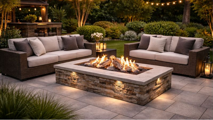 Custom fire pit and fireplace design and installation including gas, wood, and propane options.