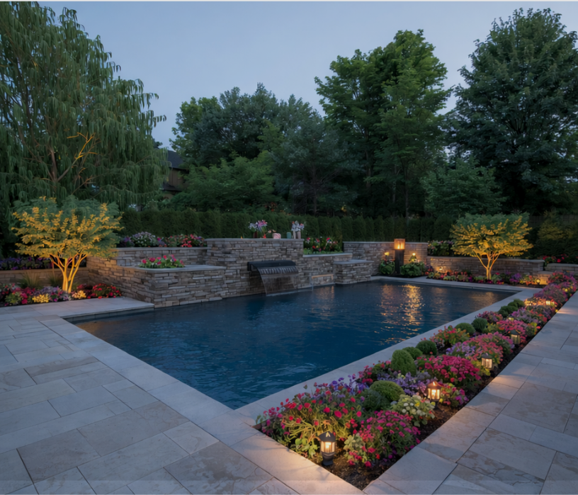 Custom patio, walkway, and poolside installation using concrete, brick, and natural stone pavers.
